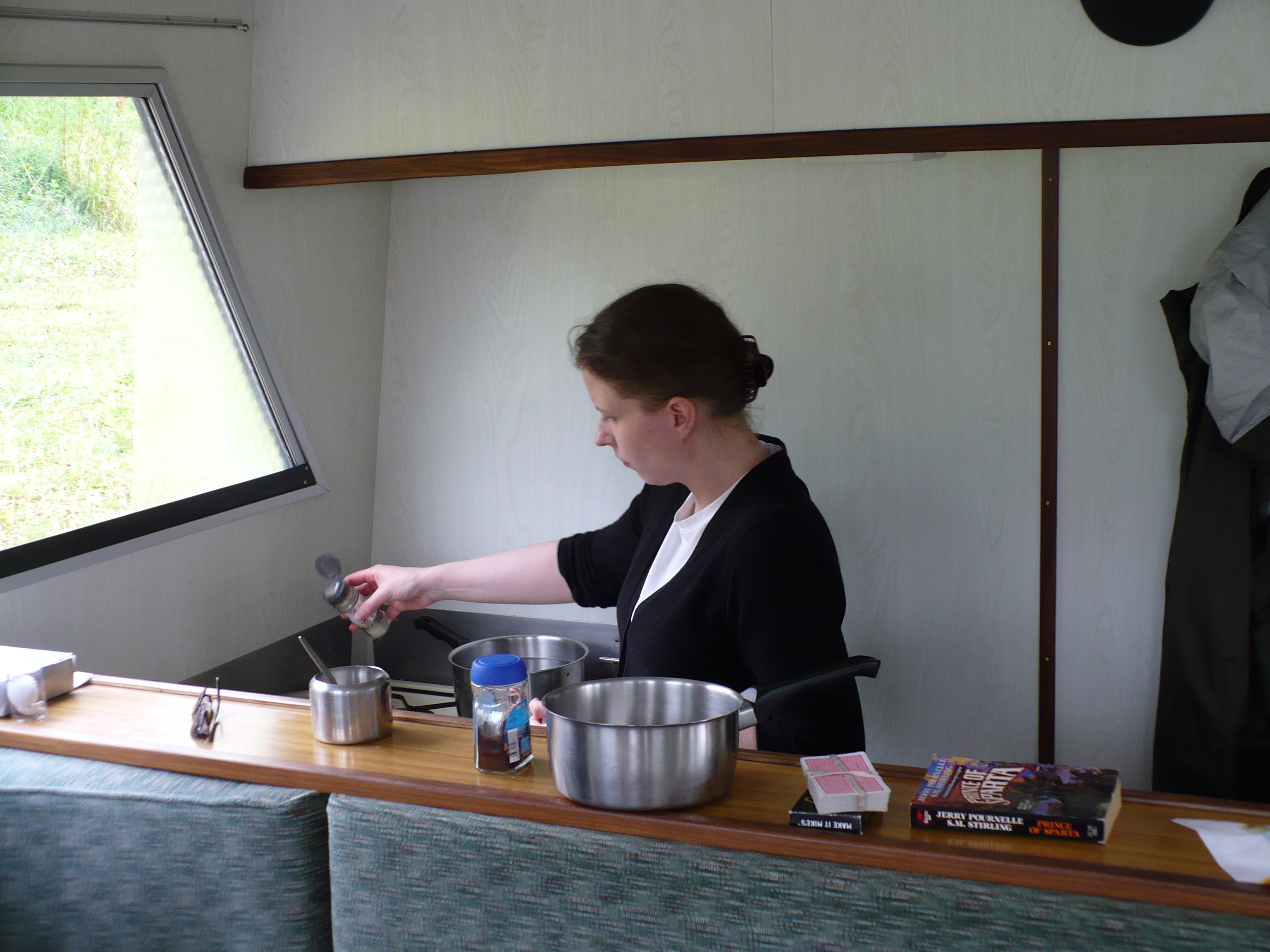At the station we boarded our train, a double decker commuter, quite unlike our previous train. After a short wait in the mostly empty car, it started to move and we waved goodbye to our boat, looking sad and forlorn across the basin. Then L settled in to read Madame Bovary and the rest of us sat back and watched the countryside roll by.