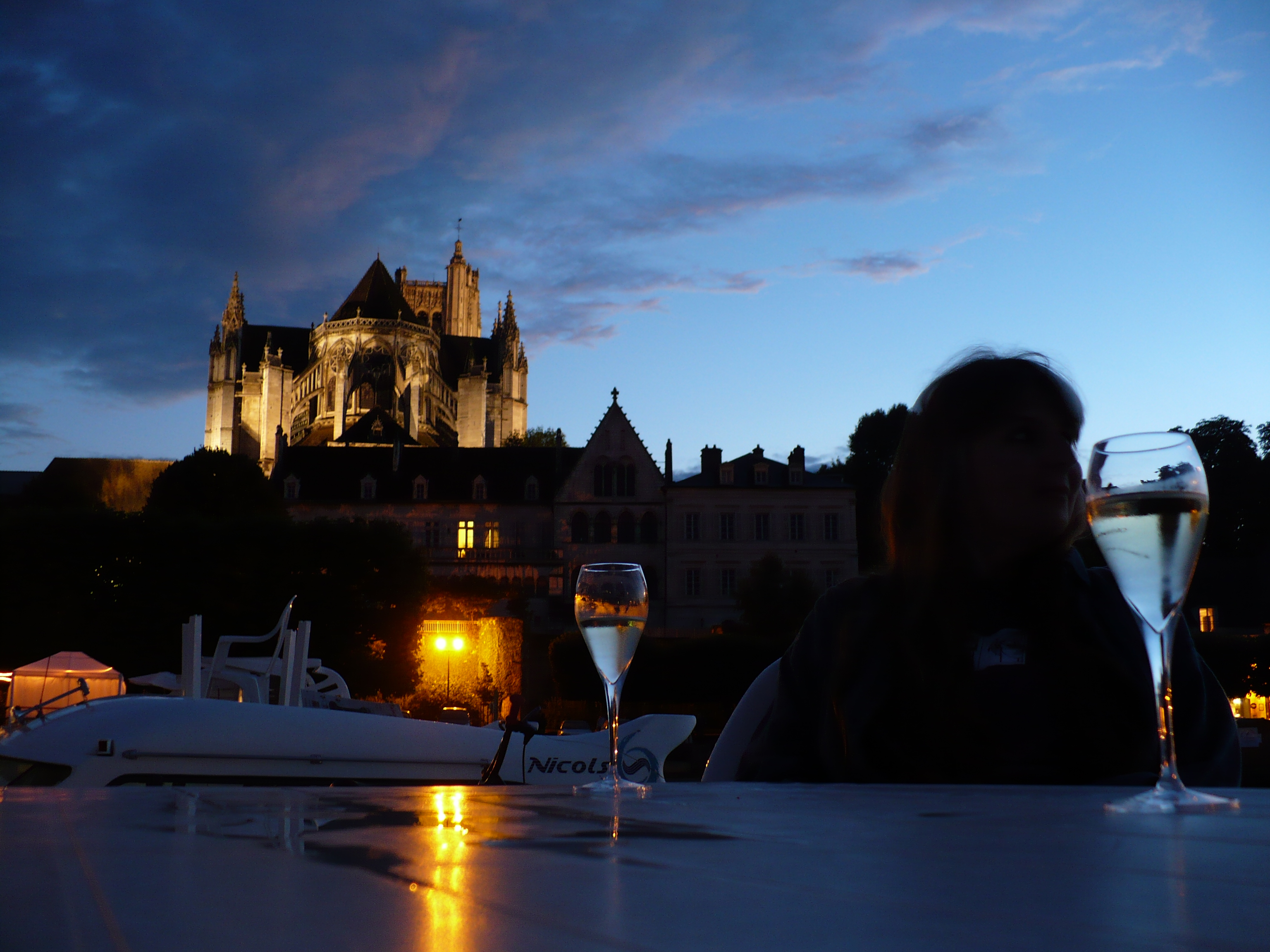 As the evening wore on we eventually settled in back on the upper deck of our boat with some Chablis and watched the lights of the city. We had discovered why the left back was empty of boats; it was because there were to be fireworks and we had the best seat in the house. Seriously, they were right over our heads. We found out later that Auxerre has some of the biggest Bastille Day fireworks in France. Best show I’ve ever seen. And a grand and glorious end to a great day.