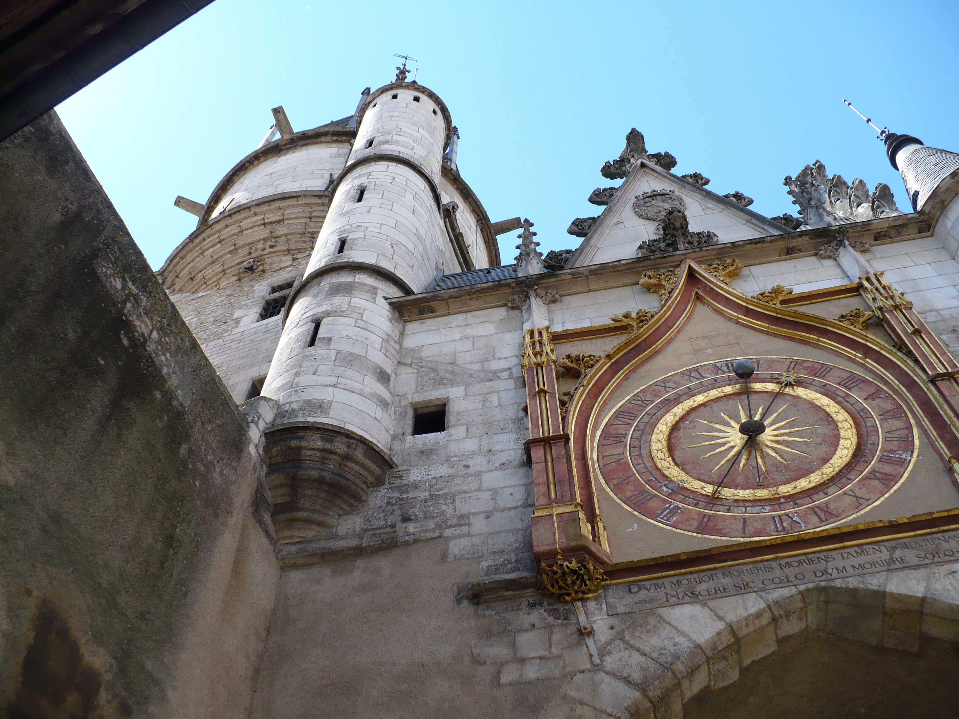 Then it was on to Abbey of Saint-Germain (dating from 9th century). The website has some great info. The crypt has some of the most ancient mural paintings in France, and houses the tomb of the bishops of Auxerre. The site includes the chapter room (12th century), the cellar (14th century) and the cloister (17th century). This was an abbey (where monks hang out), so it had our first real example of cloisters. One of the more interesting (to me) thing about this edifice is the approach to it is very unassuming. I suppose since it wasn’t meant for public-facing worship the facade was not as important as it would be on a similarly sized cathedral. It was pretty damn fancy from other angles though.