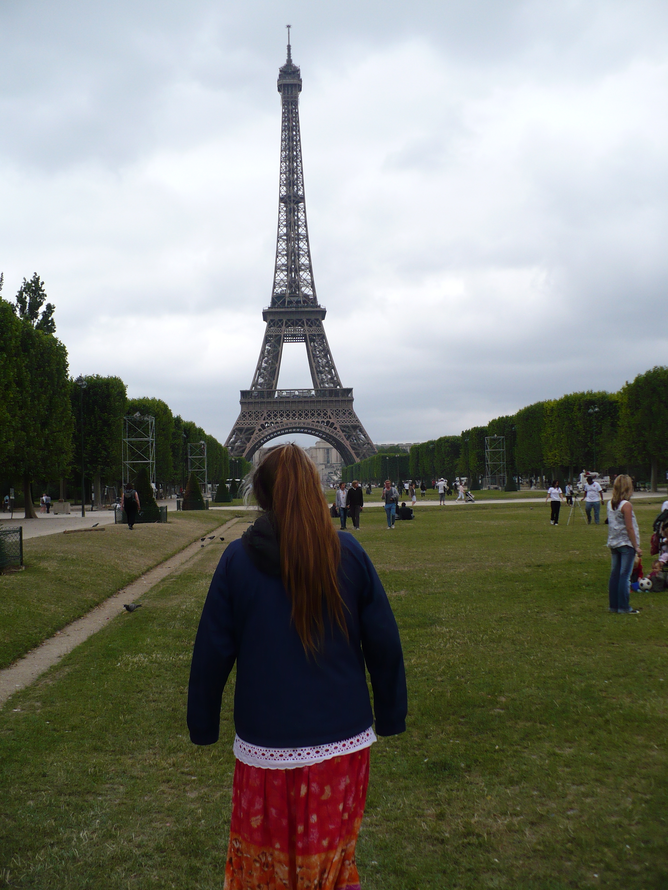 We wandered by the Museum of Natural Heritage but then ducked down into the Metro. One of my first experiences with big city transit, I was was suitably impressed with how easy it was to navigate (once we figured out the ticket machines) and soon we were off scurrying across underground Paris. We popped up somewhere near the Eiffel Tower, although we couldn’t actually see it, and eventually came across the long grassed green (Champs de Mars) that leads to the base of the tower. We took our time and meandered along and soon were directly under Mr. Eiffel’s amazing edifice. No one particularly wanted to wait in the long lines to ascend so we read the signs, admired the legs and ate a couple of baguette dogs.