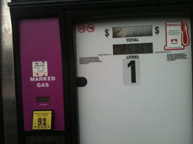 Morning was, up and breakfast at Timmies. We hit the road and stopped on the outskirts of town at a Petro Canada. This was the first time I had ever seen purple for sale at a public pump… Cool.