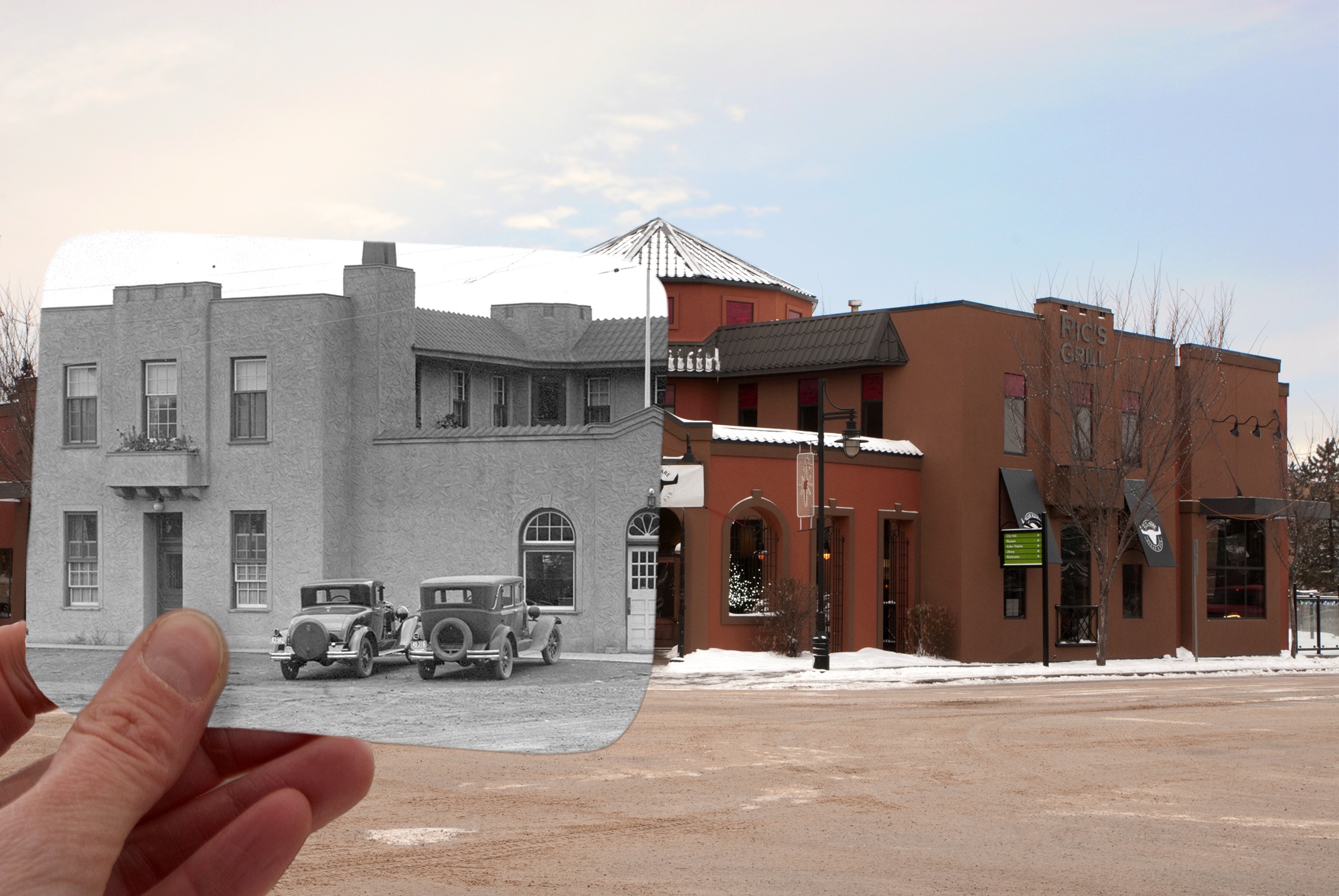 So we decided to blend three separate images in photoshop to get the desire effect. One was the original archival photo, one was a shot of the restaurant that was built to mimic the Bruin Inn’s architecture and one was of a hand holding a picture. With a lot of careful masking the picture below was slowly built. The big issue I had right up until the last minute was I couldn’t get the thumb to look like it wasn’t “photoshopped” in, which I didn’t want, even though it was. I fought with it several times in vain, but it wasn’t until Zak said the thumb needed a big, soft shadow that I realized what the problem was. It still looks a little fake, but it is miles above what I had. I guess my kid’s pretty smart after all.