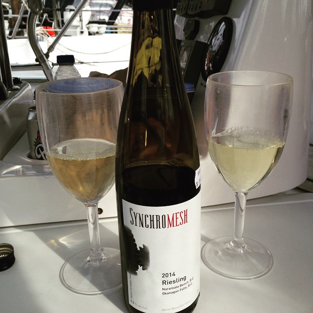 Last night we had picked up a lovely BC Riesling and had a first glass or three on board then followed up with a lovely dinner at the Sandman: wokked squid, some oysters and a bit of sushi. Nice place but I think the waiter thought we cheaped out 🙂