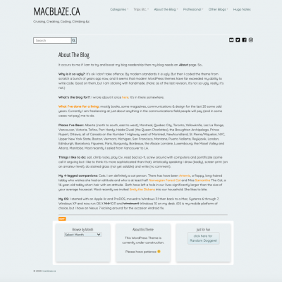 So while the look hasn’t changed much (except for some fixes/refinements I have been meaning to do for ages) the theme itself (now called MacblazeV) has been redone almost from scratch. My intent was to build it completely from scratch without borrowing any code MacblazeIV was built on a blank framework from Underscores  but this time I was trying to avoid that. In the end I did use some of their  functions for customization, but it was pretty minimal. 95% of this theme was done  from  a blank file—I am actually pretty chuffed with myself about that.